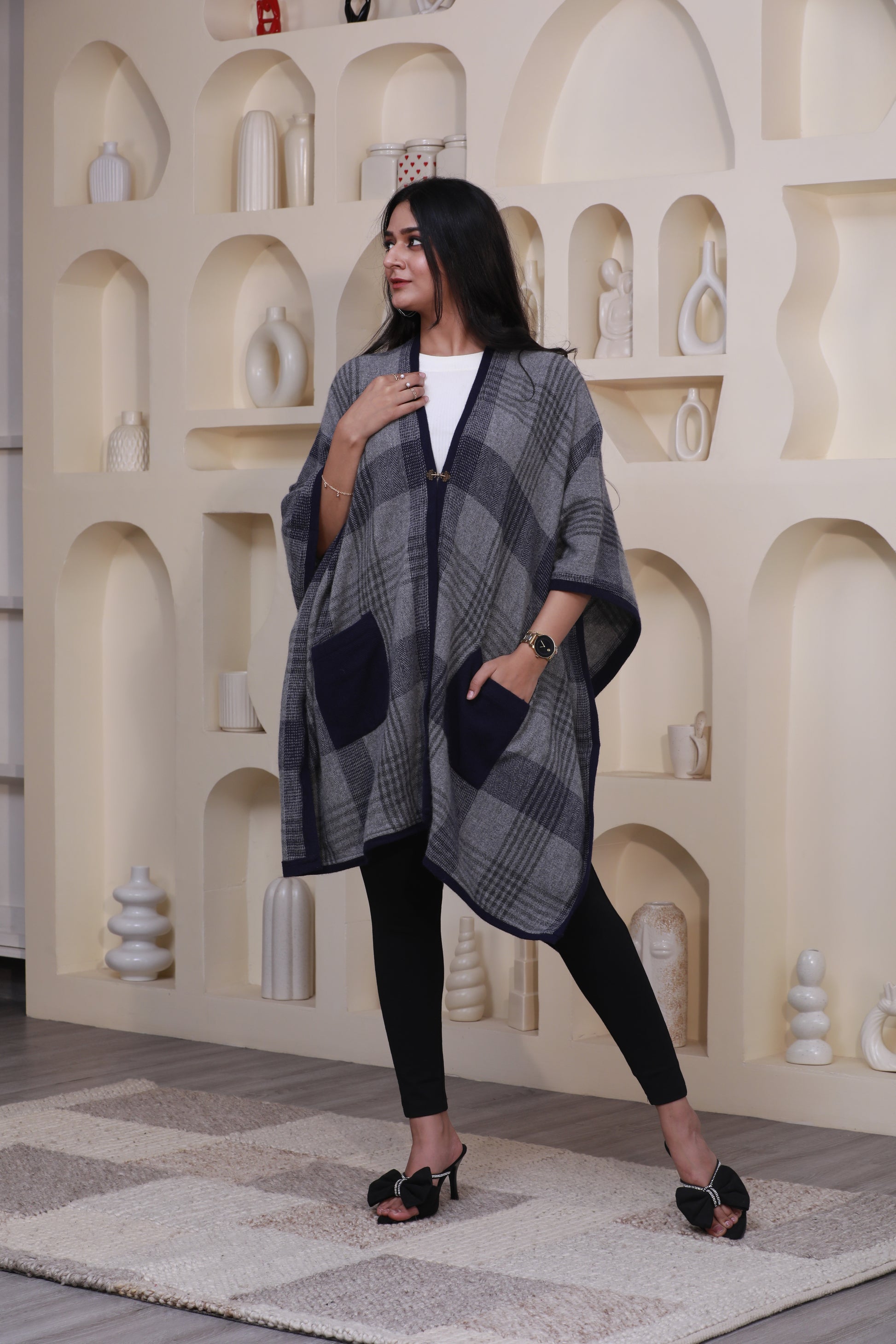 Greycrest Heritage brings a rich winter aesthetic through its blend of deep grey tones and navy accents. The oversized cape silhouette offers fluid movement while maintaining visual structure. With subtle tailoring around shoulders and practical pockets, the piece stands as a winter essential—elegant enough for city evenings yet relaxed for daily wear. A heritage style with contemporary precision.