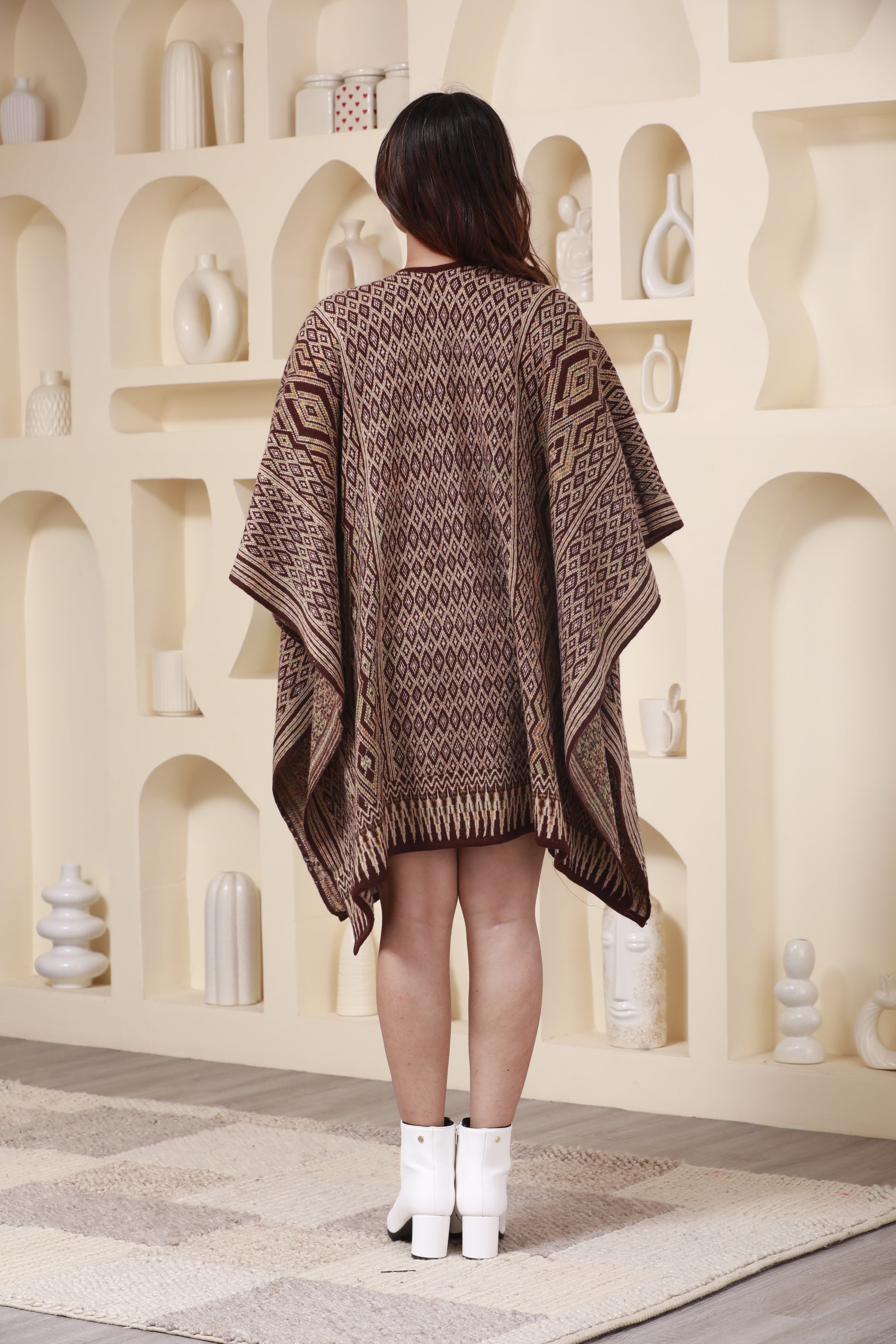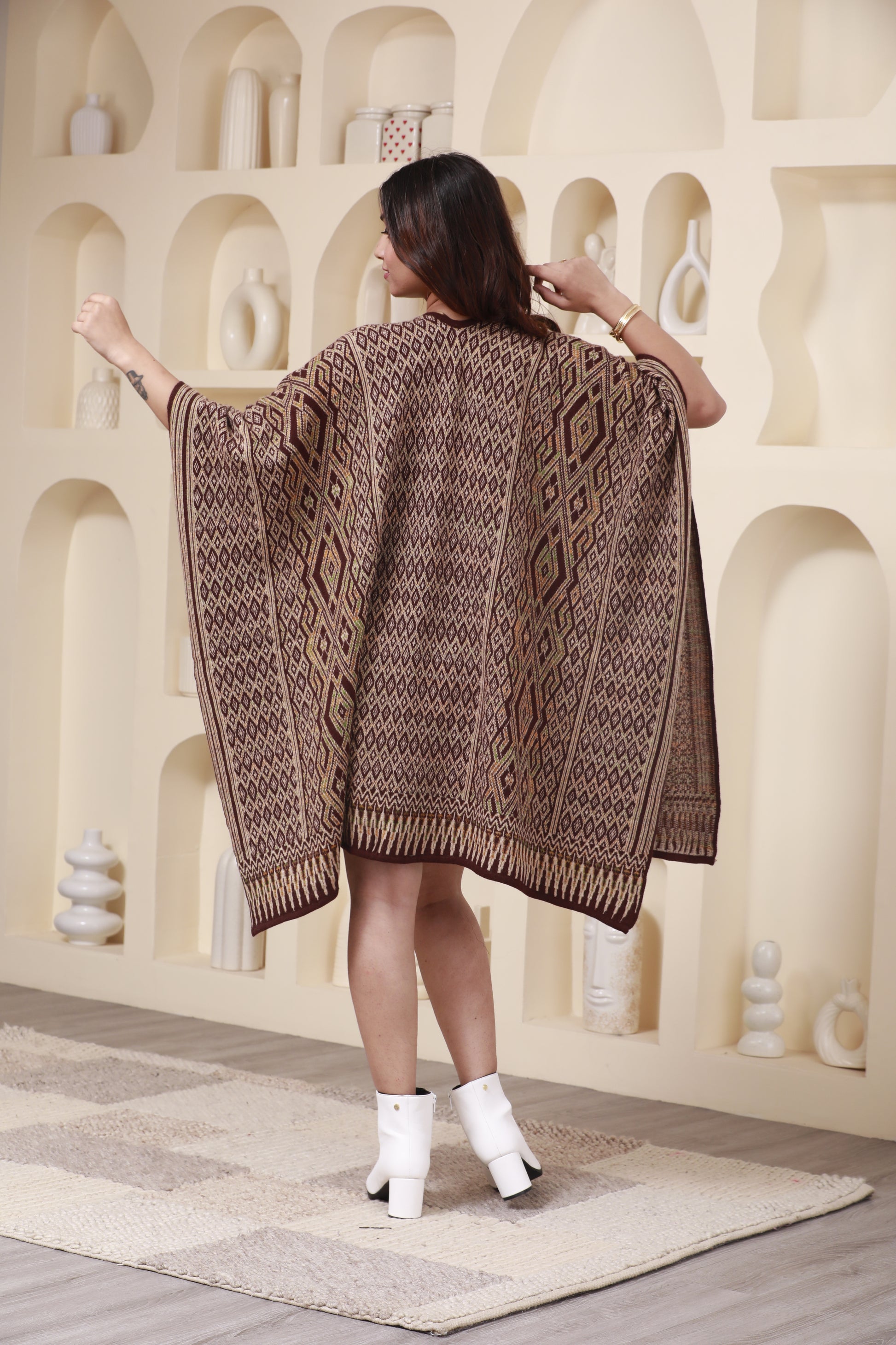 The Aztec Echo Cape celebrates bold geometry rooted in timeless tribal artistry. Featuring a rich, symmetrical pattern and a warm neutral palette, this piece commands attention without excess. Its relaxed drape and structured weave make it a statement winter layer—luxurious, confident, and unmistakably distinctive. Designed for women who appreciate heritage-inspired fashion with a polished edge.