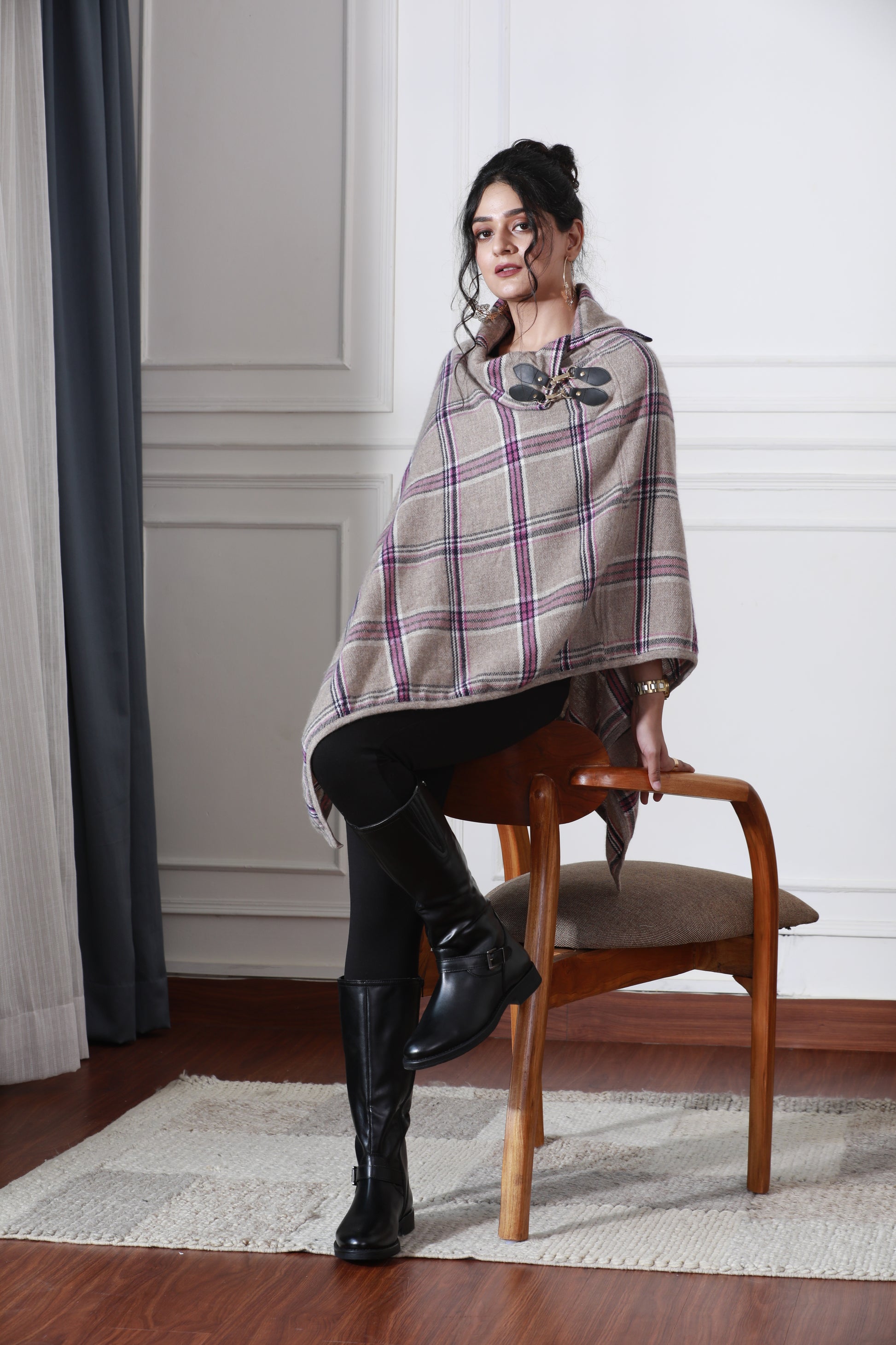 The Misty Lattice Charm Poncho embodies soft winter elegance with its mist-grey undertone and delicate plum checks. Designed to fall diagonally for an elongated effect, it is both flattering and functional. The poncho’s smooth drape and cozy warmth make it a versatile companion for casual outings, travel days, or elevated winter looks.