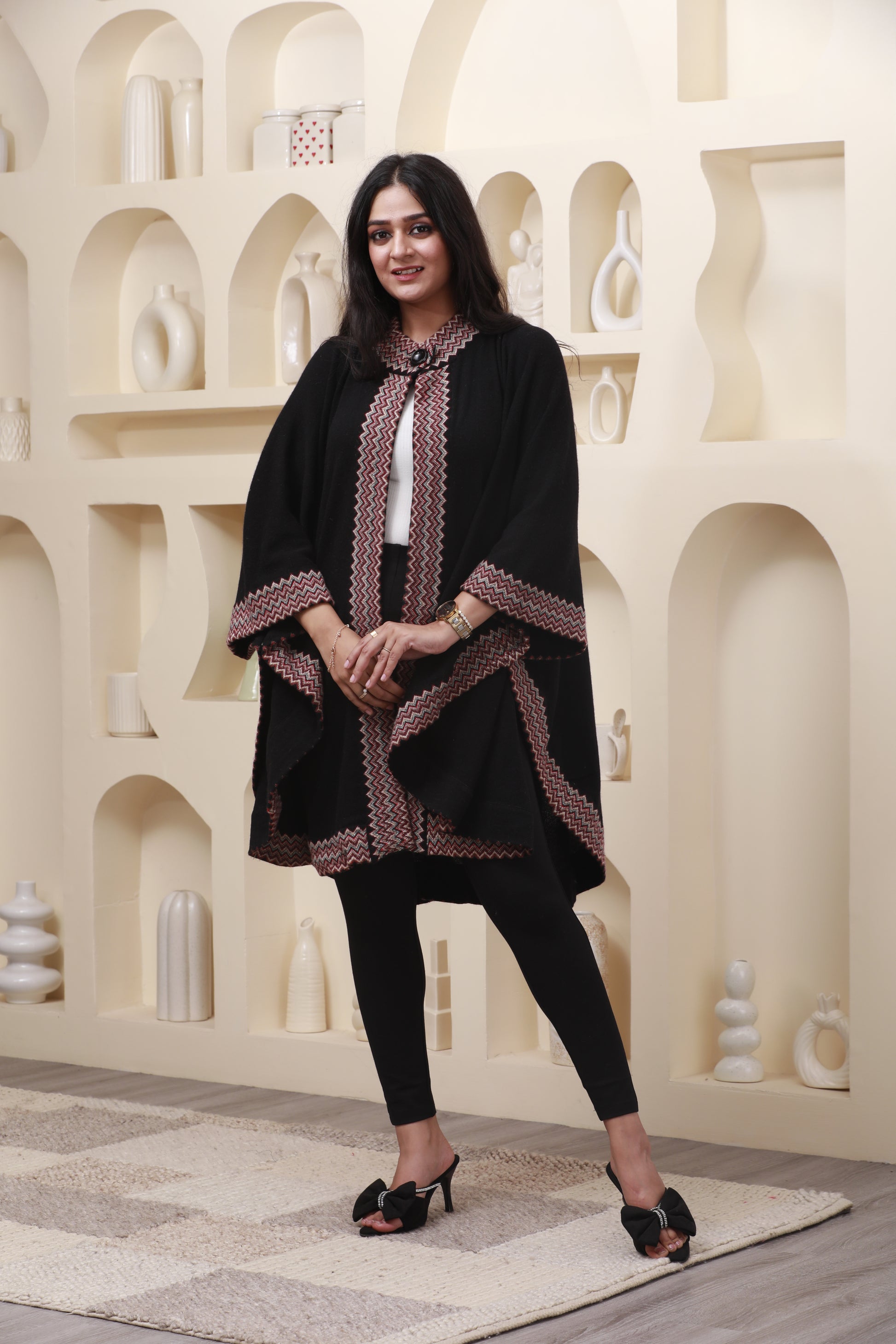The Emberline Drift Cape-Poncho blends soft movement with bold woven detailing. The deep black base creates a dramatic canvas, while the ember-toned zig-stitch borders add structure, contrast and visual rhythm. Designed with a graceful tie-front neckline, it drapes effortlessly — giving you freedom, warmth and unmistakable style.