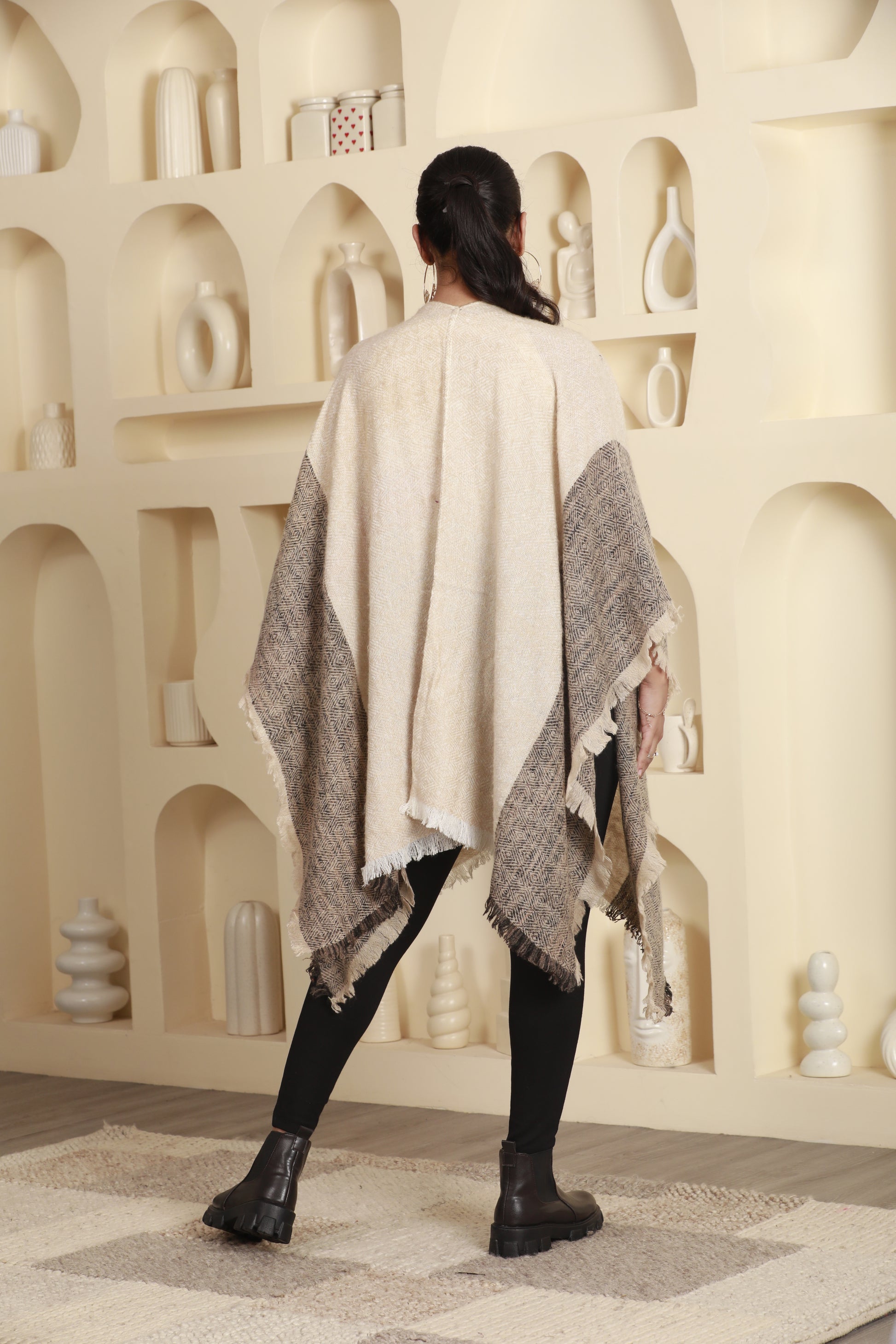 The Dune Harmony Cape features a soothing blend of cream and weathered taupe, creating a naturally balanced aesthetic. The textured weave and frayed edges add subtle depth, while the fluid silhouette brings movement and comfort. Ideal for transitional days, winter layering, and refined casual outfits.